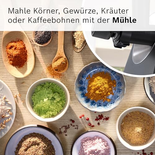 - Lieferumfang: Einfüllschale, Stopfer, doppelseitiges Messer, Reinigungsbürste, 3 Lochscheiben (3, 4,5, 8 mm), Wurst-Aufsatz, Kebbe-Aufsatz, Reibe-Aufsatz mit 4 Trommeln (fein, grob, Schneiden, Raspeln), Entsafter, Zitruspresse, Gebäck-Aufsatz und Mühle