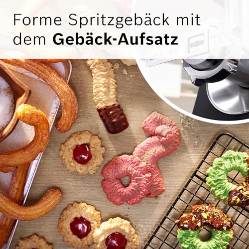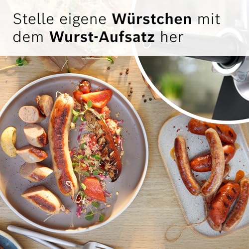 Einzelheiten: Der leistungsstarke Bosch MultiPower Serie 6 Fleischwolf mit Power System - bestehend aus einem 2.100 Watt Motorblock, Planetengetriebe, Metallkupplung und doppelschneidigem Messer - ermöglicht die Zubereitung großer Mengen im Handumdrehen. Dank der großzügigen Kammer verarbeitet der Fleischwolf bis zu 3,5 kg Fleisch pro Minute. Das Power System sorgt dabei für eine kraftvolle und effiziente Verarbeitung - auch bei faserigem Fleisch und hartem Gemüse. Das robuste Gehäuse, die hochwertige Kammer und präzise Mahlteile versprechen hohe Stabilität, Zuverlässigkeit und Sicherheit. Zusätzlich ist dieser Fleischwolf so konzipiert, dass er sich reparieren lässt. Ob Fleisch, Fisch oder Gemüse: alles kann nach eigener Vorliebe zu Burger-Patties, Fleischbällchen, Kebbe, Würste, Salate, frische Säfte, Gebäck oder gemahlenen Nüssen verarbeitet werden. Der Bedienknopf ermöglicht die Auswahl zwischen zwei Geschwindigkeitsstufen. Dank der Rücklauffunktion können blockierte Lebensmittel einfach gelöst werden. • Leistungsstarker Motorblock mit 2.100 Watt • Hohe Kapazität: 3,5 kg Fleisch pro Minute zerkleinern • Smarte Aufbewahrungslösungen • Zwei Geschwindigkeitsstufen und Rücklauffunktion • Inklusive Zubehör: Einfüllschale, Stopfer, doppelseitiges Messer, Reinigungsbürste, 3 Lochscheiben (3, 4,5, 8 mm), Wurst-Aufsatz, Kebbe-Aufsatz, Reibe-Aufsatz mit 4 Trommeln (fein, grob, Schneiden, Raspeln), Entsafter, Zitruspresse, Gebäck-Aufsatz und Mühle
