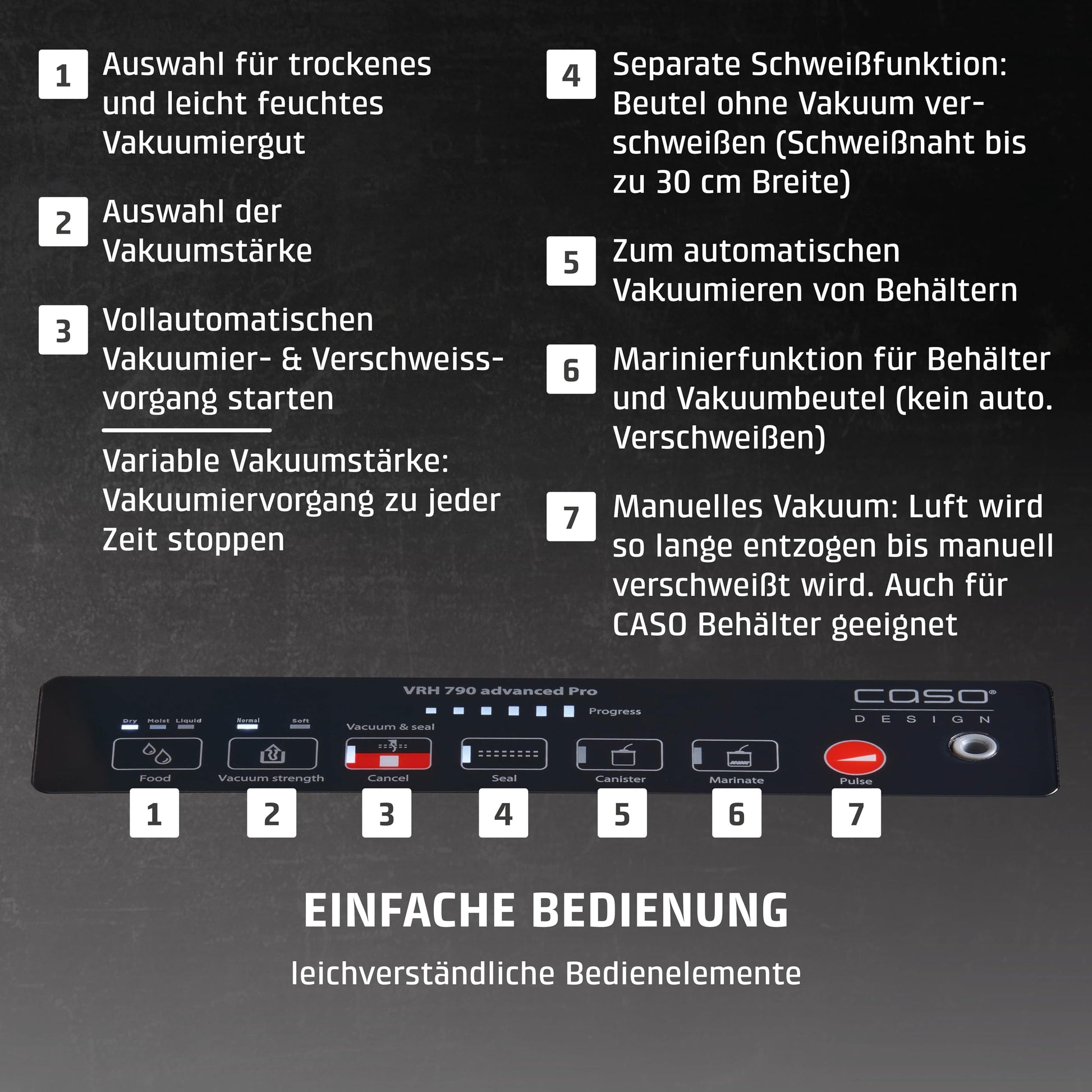 Einzelheiten: CASO VRH 790 advanced Pro - Vakuumiersystem / Mit innovativer CASOTEK® Liquid Funktion – ideal für das Vakuumieren von Flüssigkeiten, wie Suppen, Saucen, Fonds etc.; mit „Liquid Stop“ – vakuumieren mit rechtzeitigem Beenden ohne das Einsaugen von Flüssigkeit; Inkl. Vakuumbeutel mit praktischem Standboden / Lebensmittel 100% aromadicht und bis zu 8x länger frisch aufbewahren / Für den anspruchsvollen Hobbykoch, Jäger und Angler etc. / Starke Doppelkolbenpumpe (20 l/min) für ein Vakuum von bis zu -0.90 bar / Multi-Zyklus: Bis zu 200 Schweißvorgänge non-stop ohne zu überhitzen / Doppelte, sichere Schweißnaht bis 30 cm (je 2,5 mm dick) / Mit integrierter Rollenbox (Rollenbreite max. 30 cm) + Cutter / Sensor-Touch Panel mit weißer LED-Anzeige und Fortschrittsanzeige / Hochwertiges Edelstahlgehäuse mit Anti-Fingerprint-Beschichtung und Edelstahlgriff / Herausnehmbare Auffangschale für angesammelte Flüssigkeit / Vielseitige Funktionen: Einstellbare Schweißzeit (inkl. Liquid-Funktion); Vakuumstärke – für harte und weiche Lebensmittel; „Vac & Seal / Cancel“ – Autom. Vakuumieren und Versiegeln; Manuelles Verschweißen; Vakuumbehälter – Vakuumieren von geeigneten Behältern* ; Marinieren – schnelles Marinieren durch abwechselndes Öffnen und Schließen der Fleischporen durch pulsierendes Vakuum; Pulsfunktion – manuell wählbare Vakuumstärke / Inkl. umfangreichem Zubehör: 2 Vakuumrollen (20x300 cm, 30x300 cm); 10 verschiedene Vakuumbeutel mit praktischem, breitem Standboden (5x 20x30 cm, 3x 25x35 cm, 2x 30x40 cm); 1 Vakuumschlauch für geeignete Vakuumbehälter; CASO Food Manager Sticker + CASO Food Manager App