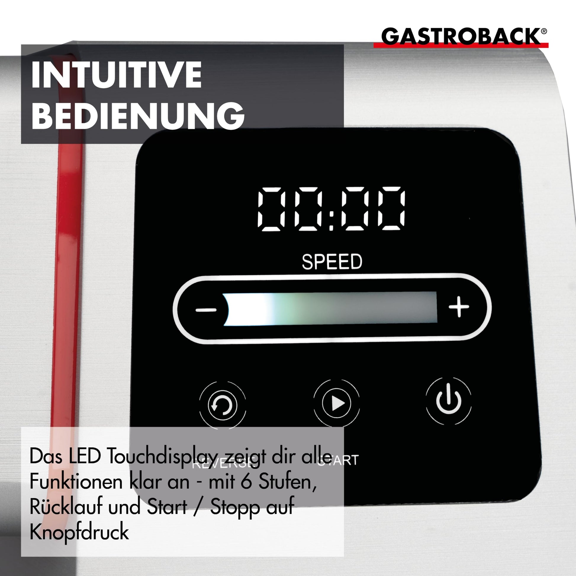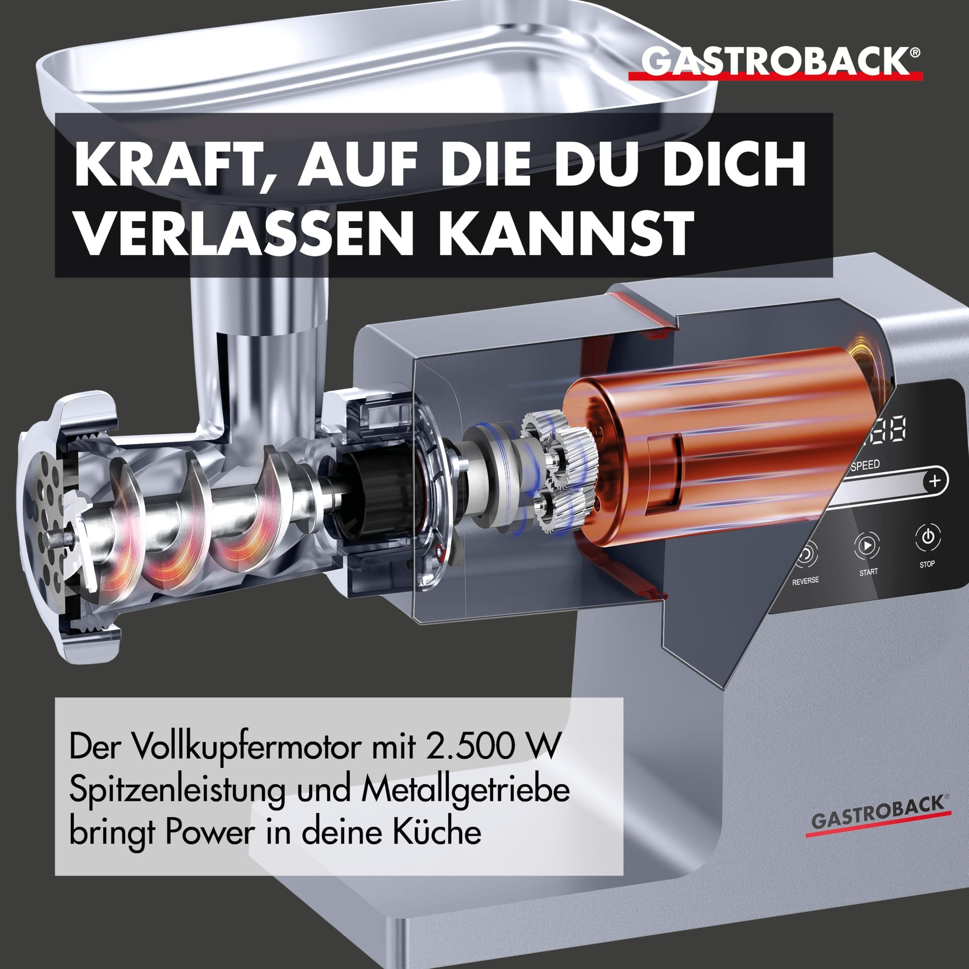 Einzelheiten: Vielseitigkeit und Leistung für Ihre Küche – der GASTROBACK Fleischwolf 6-in-1 Ob feines Hackfleisch für hausgemachte Bolognese, frische Würste nach eigener Rezeptur oder kreative Burger-Patties: Mit dem GASTROBACK Fleischwolf holen Sie sich ein kraftvolles Multitalent in Ihre Küche. Das Gerät kombiniert starke Leistung, durchdachtes Design und umfangreiches Zubehör – für maximale Flexibilität beim Kochen und Backen. Der robuste Vollkupfer-Gleichstrommotor mit 600 Watt Nennleistung (max. 2.500 Watt) verarbeitet beeindruckende 168 kg Fleisch pro Stunde. Auch zäheres Material wie Sehnen oder Gemüse wird dank des hohen Drehmoments mühelos zerkleinert. Sechs einstellbare Geschwindigkeitsstufen und eine Rücklauffunktion ermöglichen Ihnen dabei jederzeit präzise Kontrolle über das Ergebnis. Das gebürstete Vollmetall-Druckgussgehäuse, das speziell geschliffene Edelstahl-Kreuzmesser sowie die Doppel-Zahnräder aus Metall sorgen für Stabilität, Laufruhe und eine lange Lebensdauer – auch bei regelmäßigem Gebrauch. Das Sensor Touch LED-Display stellt alle Funktionen übersichtlich dar und erleichtert die Bedienung durch seine klar strukturierte Oberfläche. Mit dem umfangreichen Zubehör – darunter drei Lochscheiben (3 mm, 5 mm, 8 mm), Wurstfüller, Kebbeaufsatz, vier Spritzgebäckformen und zwei Hamburgerpressen – sind Ihrer Kreativität kaum Grenzen gesetzt. Kräuter, Fisch oder sogar Spritzgebäck lassen sich schnell und effizient verarbeiten. Ein zweiteiliges Aufbewahrungsset sorgt dafür, dass sämtliches Zubehör ordentlich und griffbereit verstaut ist. Der GASTROBACK Fleischwolf 6-in-1 ist die ideale Lösung für alle, die beim Kochen auf Qualität, Leistung und Vielseitigkeit setzen – Tag für Tag.