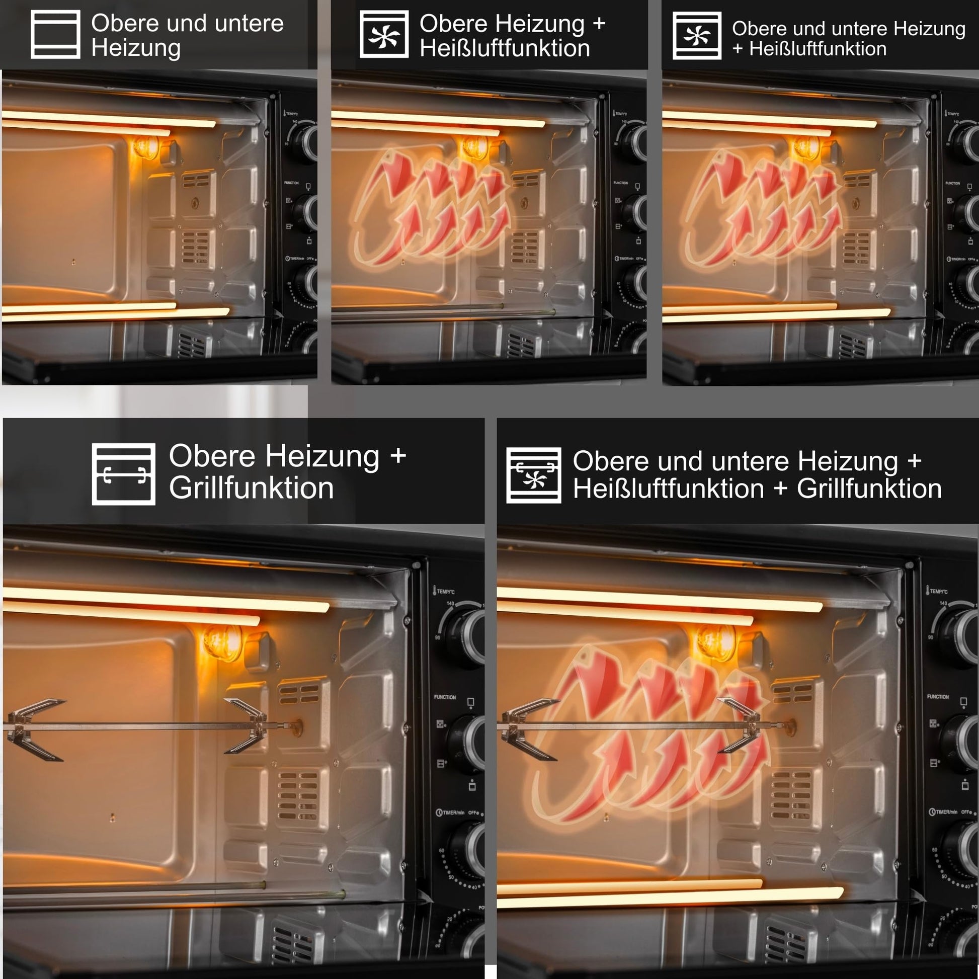 - EIGENSCHAFTEN: Der Backofen überzeugt nicht nur mit seiner hohen Wattleistung von 1800W, sondern auch mit seiner Vielseitigkeit. Es bietet 5 Backfunktionen, darunter Umluft, Umluft mit Unterhitze, Oberhitze, Unterhitze, Ober-/ Unterhitze. Die Temperatur kann zwischen 90 und 230 Grad eingestellt werden.