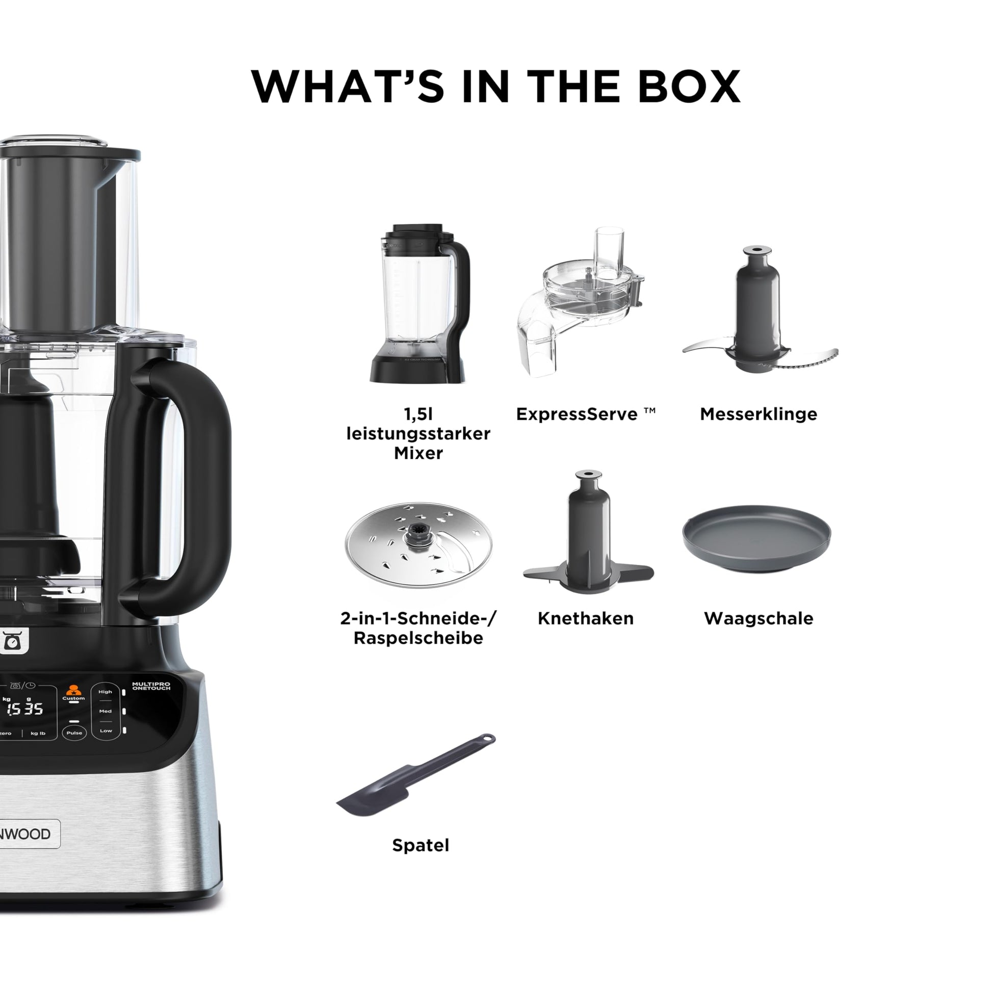 Einzelheiten: Der MultiPro OneTouch steht für grenzenlose Möglichkeiten: Neben dem einfachen Schneiden und Raspeln von Lebensmitteln verfügt das Gerät über sechs optimal voreingestellte Programme, die großartige Ergebnisse mit nur einer Berührung liefern. Knete Teig, püriere Früchte, mixe Smoothies oder bekomme perfekt zerkleinertes Eis dank 1,5L leistungsstarken Mixer mit einer Motorleistung von 1.000 Watt und füge deine persönliche Note mit deiner individuellen Voreinstellung hinzu. Wiege Zutaten mit der integrierten Waage direkt in den 3L Arbeitsbehälter ab und verliere die Zeit mit dem Timer bei der Zubereitung nicht aus dem Auge. Der MultiPro OneTouch unterstützt dich nicht nur bei der Zubereitung von Speisen. Viele Teile sind auch spülmaschinenfest. So sparst du Zeit bei der Reinigung. Im Lieferumfang ist enthalten: 4mm Edelstahl-Arbeitsscheibe zum Reiben und Schneiden, Knethaken, Messereinsatz, Express Serve Einsatz, Waagschale, 3L Küchenmaschine und 1,5L Mixaufsatz. Für mehr Sicherheit hat das Gerät eine Sicherheitsverriegelung.