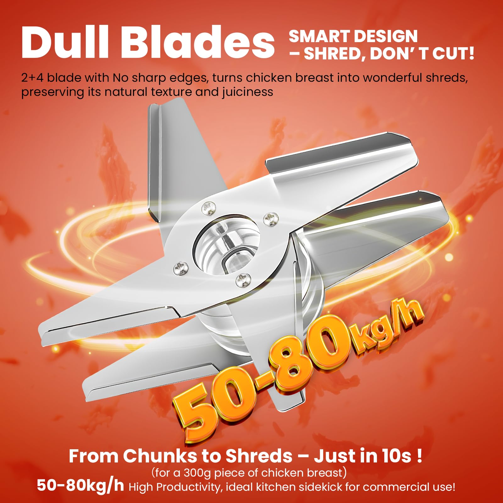 - Sichere & effiziente Zerkleinerungstechnologie - Mit 3+2 stumpfen Klingen zerkleinert er gekochte Hähnchenbrust durch Taumeln, nicht durch Schneiden. Langlebig, wartungsarm und sicherer als herkömmliche Klingen - kein Nachschärfen erforderlich.