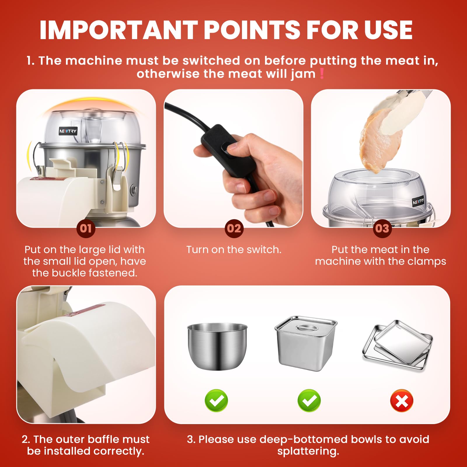 - Einfache Bedienungstipps - Schalten Sie die Maschine ein, geben Sie das gekochte Hähnchen hinzu, während sich die Paddel drehen, und decken Sie die Maschine ab, um Spritzer zu vermeiden. Den Vorgang nach Bedarf wiederholen. Bitte verwenden Sie eine breite, tiefe Schüssel, um die Hähnchenschnitzel perfekt aufzufangen.