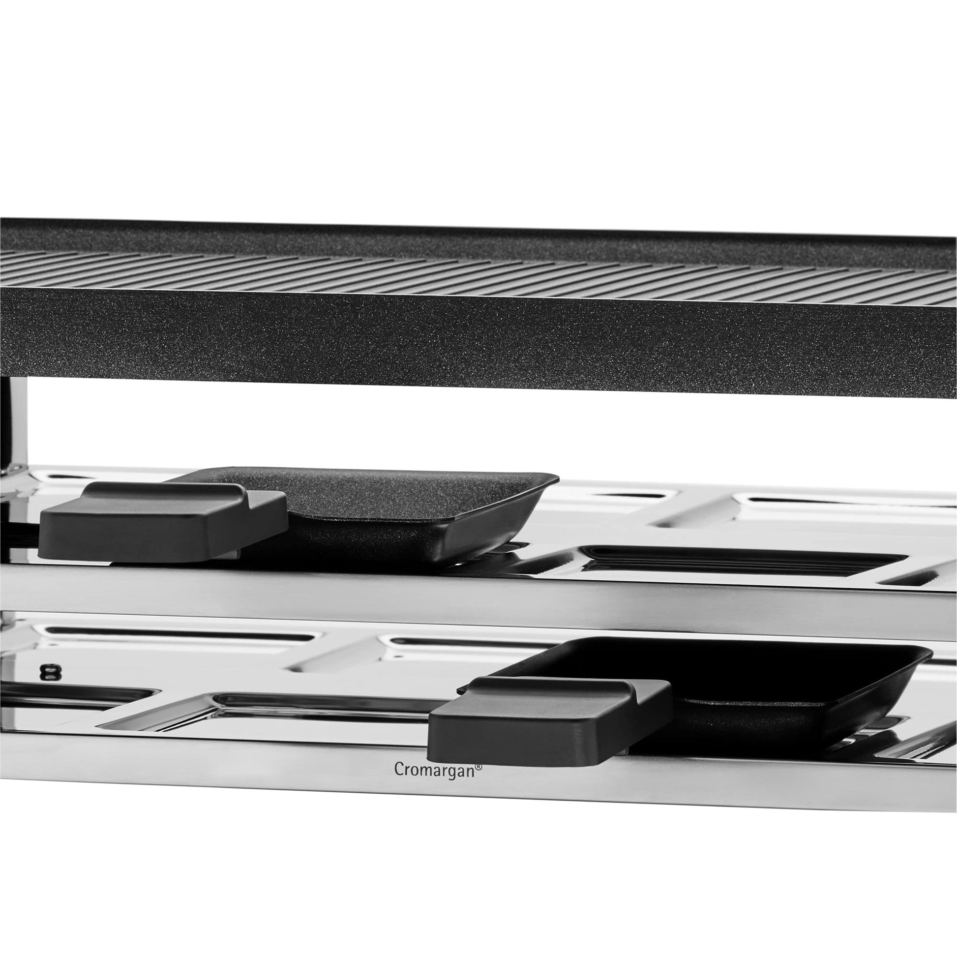 1x Raclettegerät aus Cromargan Edelstahl matt mit Wende-Grillplatte (54,5 x 24,1 x 13 cm, 1500 Watt, Grillfläche 24 x 44 cm, Kabellänge 2m, 220-240 V~, 50-60 Hz, Gewicht 4,8kg), 8x antihaftbeschichtete Raclette Pfännchen, 8x Raclette Schaber